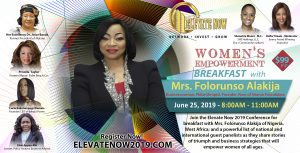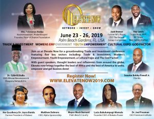 Using Trade and Investments as the main catalyst, Elevate Now 2019 will bring together leaders from Africa, America, the United Nations and beyond to learn of global investment opportunities and to educate and inspire conference attendees in five targeted areas: Trade and Investments, Women’s Empowerment, Youth Empowerment, Cultural Expo and The God Factor.