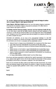 Famfa Oil Ltd commends the efforts made by the Federal and State Governments towards the fight against the pandemic in Nigeria and enjoin all Nigerians to follow stipulated health guidelines in order to keep us all safe.